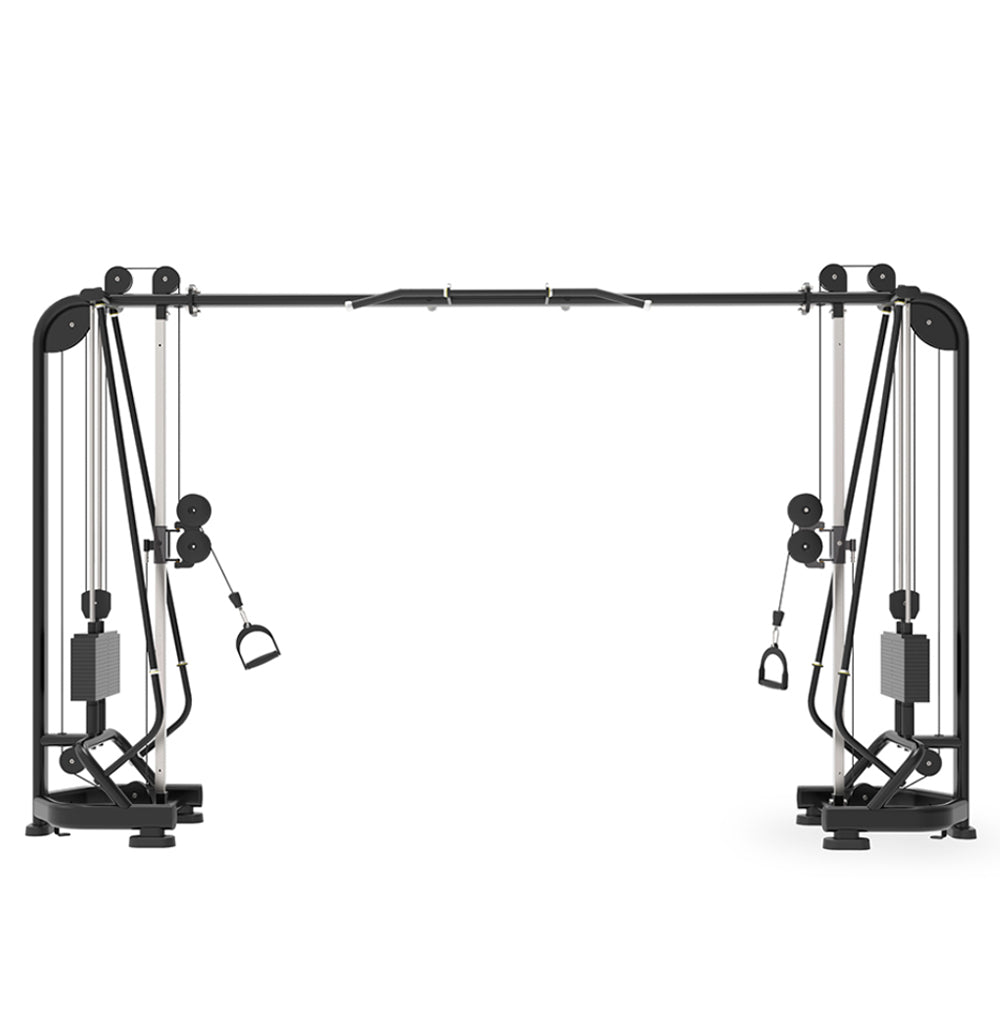 A versatile training station designed for functional strength exercises. The adjustable pulleys allow users to target various muscle groups with controlled resistance.