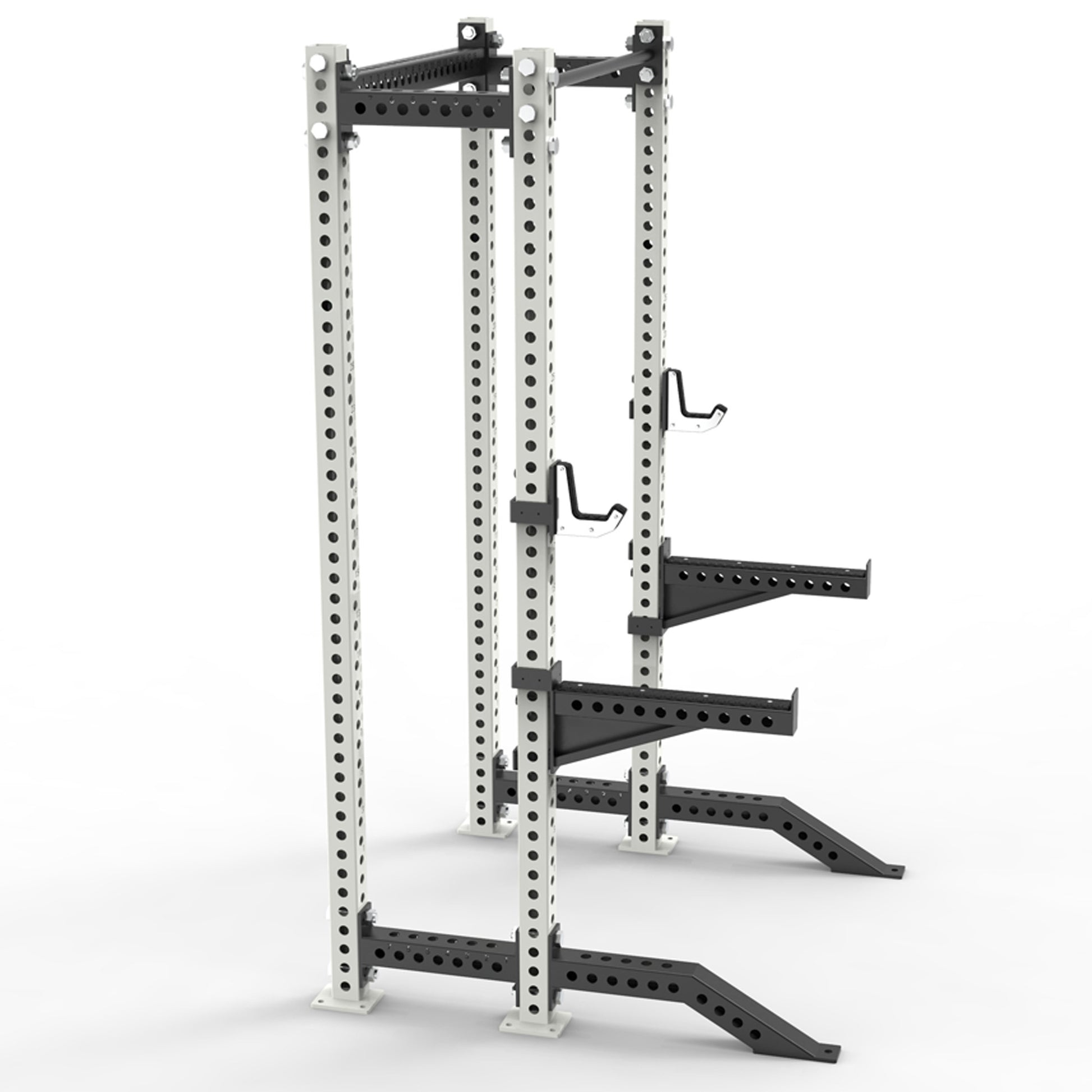 A compact and versatile strength training equipment designed for exercises like squats, bench presses, and overhead presses. It features two vertical posts with adjustable safety bars that catch the barbell in case of a failed lift, providing safety during heavy workouts